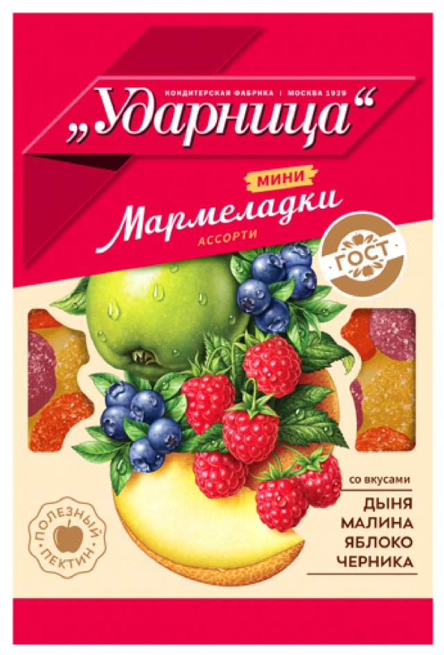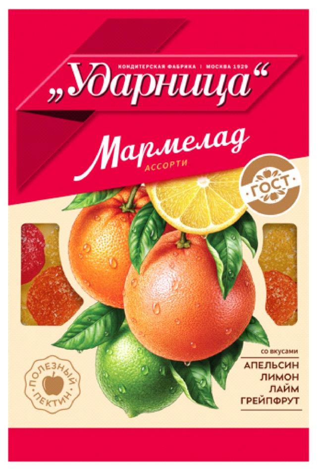 УДАРНИЦА МАРМЕЛАД АССОРТИ СО ВКУСАМИ ЯБЛОКО ПЕРСИК ВИШНЯ ЧЕРНАЯ СМОРОДИНА ПОЛЕЗНЫЙ ПЕКТИН ВКУСНО КАК В ДЕТСТВЕ ГОСТ КОНДИТЕРСКАЯ ФАБРИКА МОСКВА 1929
